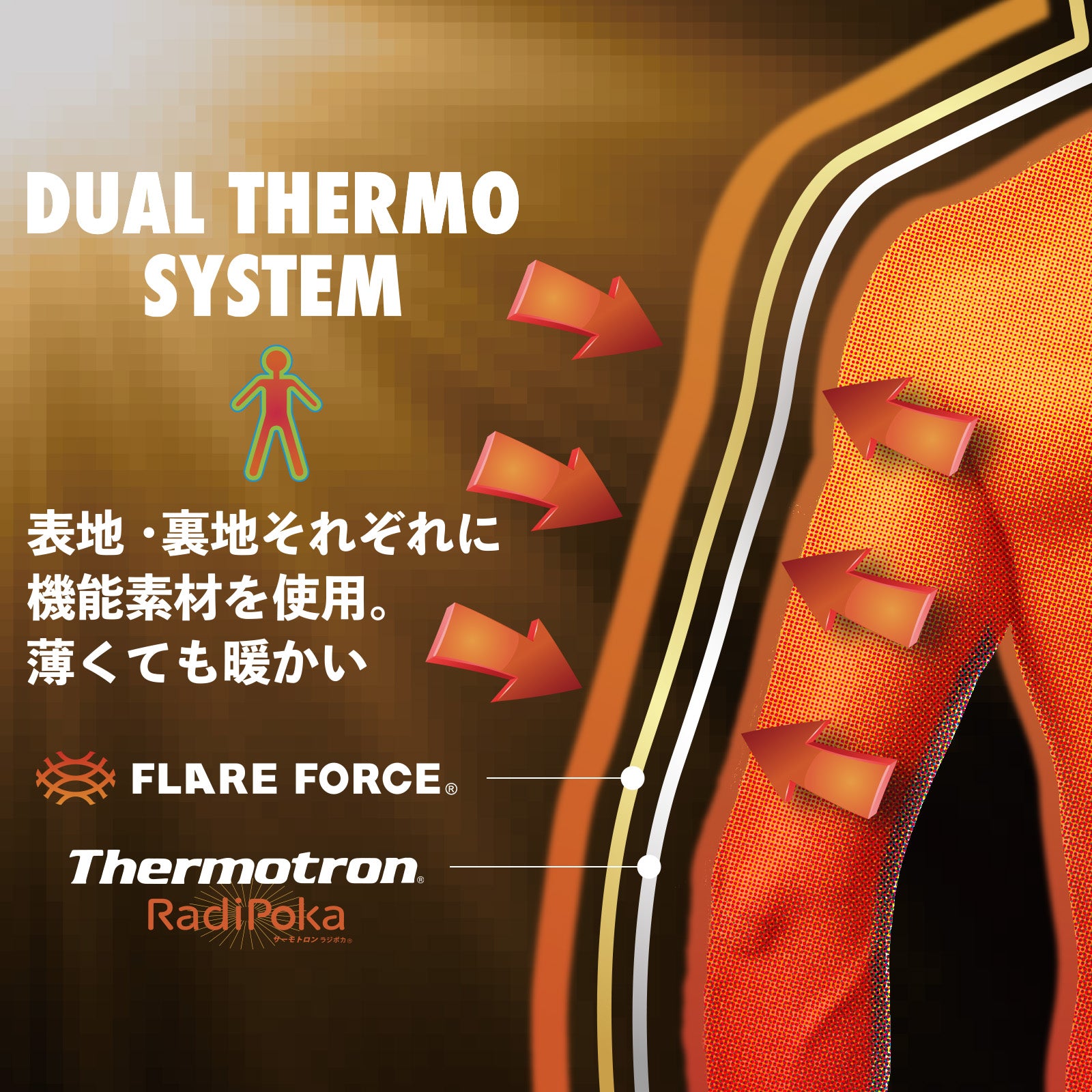 裏地には、吸光熱変換剤と遠赤外線放射機能剤を織り込んだThermotoron RadiPoka®︎を使用。曇りの日でもFLARE FORCE®の効果を補完し、プラスアルファの暖かさを実現します。